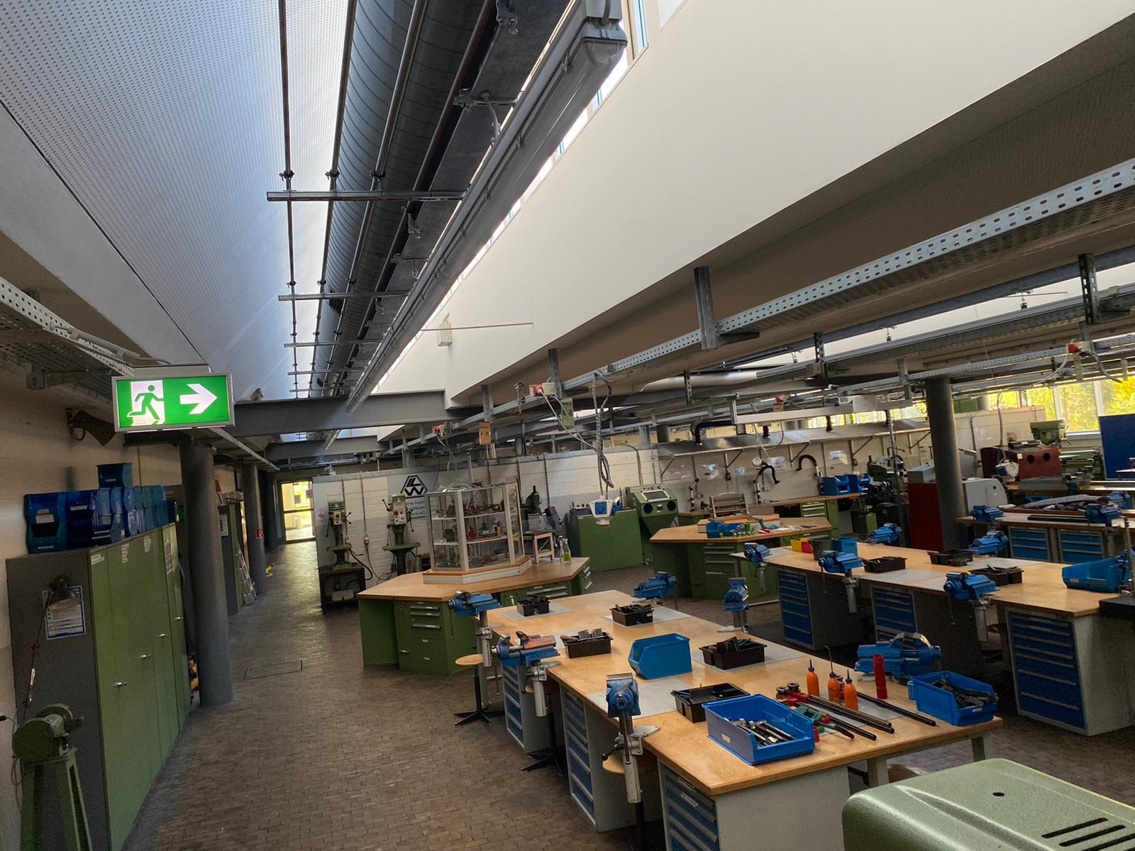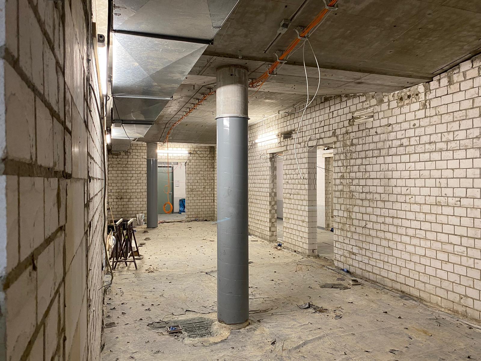 Zeitgleich erneuert die Firma Käuffer & Co. die Lüftungsanlage einschließlich der Luftheizung, neben der Warmwasserheizung die zweite Säule der Wärmeversorgung speziell für die großen Werkstatträume, die Aula und die Mensa. Die moderne Anlage saugt Außenluft an, filtert, erwärmt und führt sie in die zu beheizenden Räume. Dort saugt sie die verbrauchte Luft wieder ab und „recycelt“ sie, indem ihre Restwärme in diesem Kreislauf die aufgenommene Außenluft vorwärmt. „Technik wird tendenziell immer kleiner, nur Warmluftanlagen werden größer, weil sie dann energieeffizienter betrieben werden können“, erläutert Oliver Aßelmeyer. Deshalb müssen auch die Betonpodeste der alten Luftheizer im Untergeschoss herausgerissen und durch größere ersetzt werden.