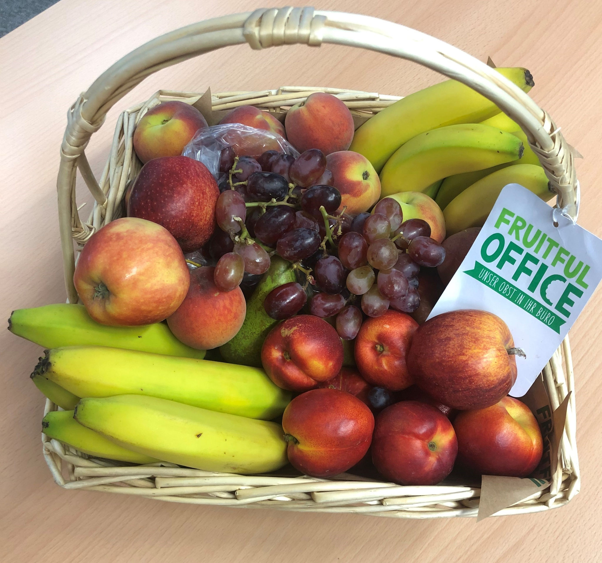 Lieferant der Obstkörbe ist das Unternehmen Fruitful Office. 2011 gegründet, beliefert es nach eigenen Angaben über 4.000 Firmenkunden mit seinen Früchtekörben. Das Obst stammt aus Deutschland und Mitteleuropa, auf Transport per Luftfracht wird aus ökologischen Gründen ganz verzichtet. Dazu pflanzt Fruitful Office für jeden gelieferten Obstkorb einen Baum in Malawi. Corinna Raisch, die beim ILW Mainz für den regelmäßigen Früchtenachschub verantwortlich ist, setzt auf den saisonalen Mix: Weintrauben, Äpfel, Bananen sowie drei bis vier wechselnde Obstsorten wie z.B. Pflaumen, Pfirsiche, Kirschen oder Beeren. „Das Obst ist immer reif und lecker, besonders beliebt sind die Bananen“, sagt Corinna Raisch, „am zweiten Tag ist der Korb regelmäßig leer.“ Darum stellt sich die Frage erst gar nicht, was mit nicht verzehrten Resten geschehen soll.